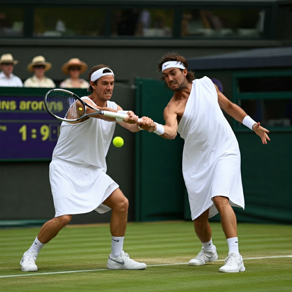 Wimbledon, London – Hold onto your strawberries and cream, folks, because Wimbledon has just witnessed a spectacle so bizarre, so utterly absurd, that it’s sent shockwaves through the very fabric of the spacetime continuum! Greek gladiators of the green, Giannis Socrates and Stefanos Aristotle, have transformed the hallowed grounds of Centre Court into a philosophical battleground, leaving the tennis world in a state of utter bewilderment (and a sticky mess).