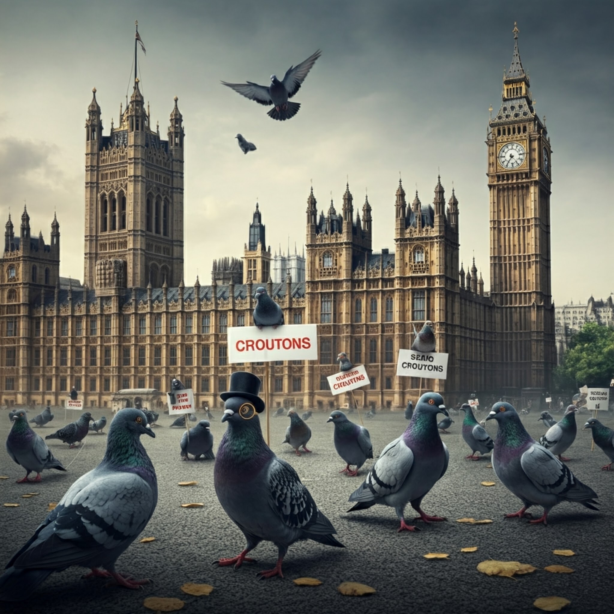 London, England – A flock of pigeons has taken a stand (or rather, a wing) against the perceived injustices faced by their kind, staging a raucous protest in Parliament Square today. Their demands? Gourmet croutons and fashionable eyewear. The avian activists, seemingly organized by a particularly dapper pigeon sporting a miniature top hat and monocle … Continue reading Feathered Fury: Pigeons Protest for Crouton Cuisine and Chic Eyewear